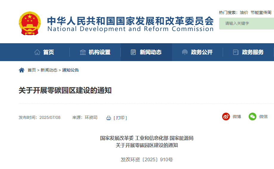 國家發展改革委 工業和信息化部 國家能源局印發《關于開展零碳園區建設的通知》 2025-07-08